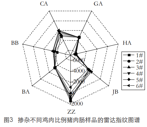 為了更直觀地將不同摻雜雞肉比例的豬肉腸樣品的信號強(qiáng)度進(jìn)行對比分析,利用Astree軟件將摻雜不同雞肉比例的豬肉腸樣品在7根不同傳感器下的響應(yīng)強(qiáng)度峰值平均分布在圓周上,并描點(diǎn)成一個(gè)雷達(dá)指紋圖譜,如圖3所示。其中,各樣品編號的摻雜雞肉比例為:1#.0%,2#.20%,3#.40%,4#.60%,5#.80%,6#.100%。