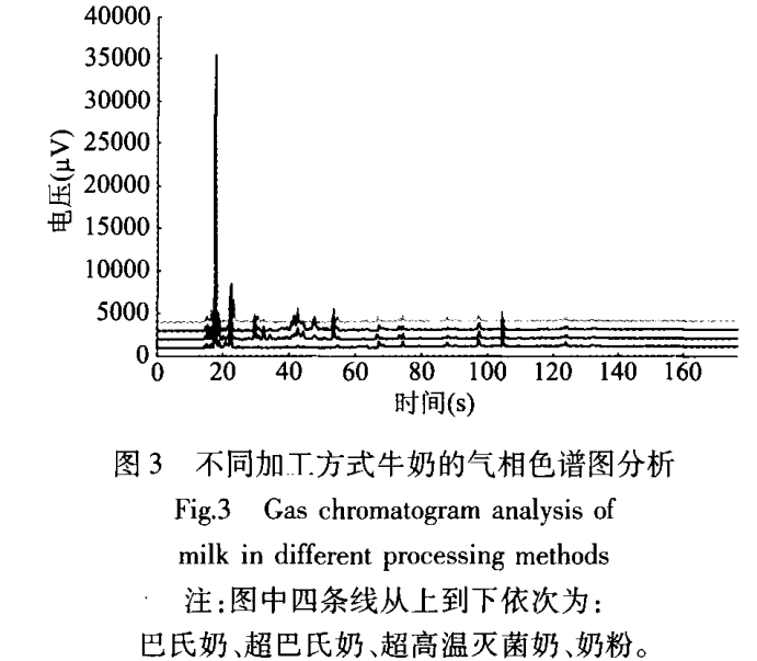 物質(zhì)定性分析 結(jié)合保留指數(shù)和Aro Chem base數(shù)據(jù)庫對特異性化合物進行定性及含量分析,不同加工方式牛奶的氣相色譜圖如圖3所示,可能含有的化合物見表4所示。閾值的大小代表了物質(zhì)氣味的強弱,相同含量的兩種物質(zhì),閾值越低則表示氣味越強烈。在表4物質(zhì)定性中假設各物質(zhì)含量相同的前提下,水介質(zhì)中氣味最強的物質(zhì)是1一辛烯(閾值是5X 10‘4)。同時,由于儀器的檢測器是氫離子火焰檢測器,為質(zhì)量型檢測器,物質(zhì)含量的高低則表現(xiàn)在峰面積大小上,表4中列出了在各個保留時間上的峰面積,并通過峰面積大小對樣品含量的差別進行排序。結(jié)果顯示隨著加工溫度升高,丙酮、2一丁醇、辛二烯、己酸和甲硫醚的含量也隨之增多。同時,甲基環(huán)己烷羧酸、丙酮、2一丁醇和水芹烯在奶粉的加工工藝中出現(xiàn)了大量的損失。甲硫醚是牛乳產(chǎn)品中特有的有機化合物,且其嗅覺閾值較低,氣味強度較高,其含量稍高便會產(chǎn)生異味。如表4所示,甲硫醚在巴氏奶中的含量比在超巴氏和超高溫滅菌奶中的低,因此加工工藝對甲硫醚的含量產(chǎn)生了一定的影響,從而影響了樣品的整體風味。