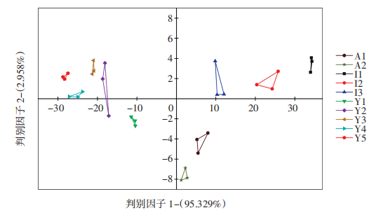 DFA結(jié)果分析對(duì)10種辣木籽電子鼻數(shù)據(jù)進(jìn)行DFA結(jié)果分析,見(jiàn)圖5。由圖5可知,I1、I2和I3分布在DF1正半軸,A1與A2分布在第二象限內(nèi),Y1、Y2、Y3、Y4和Y5則分布在第三象限內(nèi),說(shuō)明同一品種辣木籽的氣味相近,不同品種之間氣味上有較大差異。3個(gè)品種辣木籽響應(yīng)值分布在不同區(qū)域內(nèi)且無(wú)重疊,因此可用于判別不同品種辣木籽,與色譜圖分析一致。