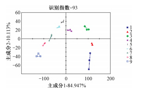 懷區(qū)9種不同主栽品種懷地黃RSD分別為0.42%、1.35%、0.56%、0.34%、0.42%、0.22%、0.22%,樣品3次重復(fù)間相對(duì)標(biāo)準(zhǔn)偏差都比較小,說(shuō)明樣品在重復(fù)測(cè)試過(guò)程中電子舌儀器的穩(wěn)定性、重現(xiàn)性好。由圖5可知,PC1與PC2的貢獻(xiàn)率之和達(dá)到了95.060%,其識(shí)別指數(shù)為93,說(shuō)明這9種生地黃樣品滋味能夠快速地通過(guò)電子舌很好區(qū)分開(kāi)來(lái)。在主成分分析圖中,樣品間的相對(duì)距離越近,則樣品整體滋味越接近,其中“金九”與“85?5”樣品的相對(duì)距離最近,滋味差別最??;“噸王”與“沁懷”的相對(duì)距離最遠(yuǎn),滋味差別最大。