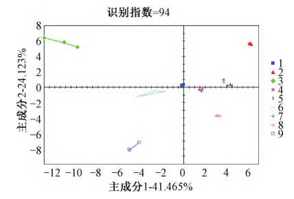 采用Alpha soft軟件對(duì)所得數(shù)據(jù)進(jìn)行分析,利用主成分分析(PCA)法,通過(guò)對(duì)原始數(shù)據(jù)向量進(jìn)行線性變換,對(duì)多個(gè)數(shù)據(jù)進(jìn)行降維處理,轉(zhuǎn)化為少數(shù)綜合指標(biāo)。