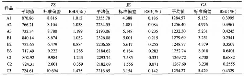 表 1表 示 各 傳 感 器 對(duì) 樣 品 的判 別 指 數(shù) ,而 判 別 指 數(shù) JE >ZZ>GA>JB,可 見 傳 感 器 響 應(yīng) 強(qiáng) 度 與 對(duì) 樣 品 的 差 異 判 別 能 力 不 是 線 性 關(guān) 系 ,如 ZZ雖 響 應(yīng) 強(qiáng) 度 較 小 但 對(duì) 咖 啡 樣 品 有 較 高 的 差 異 判 別 指 數(shù) ,經(jīng) 過(guò) 判 別 指 數(shù) 和 響 應(yīng) 強(qiáng) 度 綜 合 確 定 傳 感 器 為 JE、GA 和 ZZ。傳 感 器 對(duì) 咖 啡 樣 品 響 應(yīng) 強(qiáng) 度 值 、標(biāo) 準(zhǔn) 偏 差 和 相 對(duì) 標(biāo) 準(zhǔn) 偏 差 (RSD) 見 表 2。