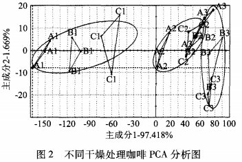 電 子 舌 能 夠 較 好 的 區(qū) 分 不 同 干 燥 處 理 方 式 的 咖 啡 ,主 成 分 1的 貢 獻(xiàn) 率 及 判 別 因 子 1的 貢 獻(xiàn) 率 , 均 達(dá) 到 90% 以 上 ,PCA 分 析 與 DFA 分 析 證 明 結(jié) 論 一致 ,說(shuō) 明 兩 種 分 析 方 式 對(duì) 咖 啡 樣 品 均 具 有 良 好 的 區(qū)分 。