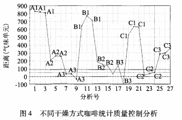 咖 啡 濕 豆 干 燥 通 常 以 太 陽(yáng) 光 自然 干 燥 為 主 ,該 實(shí) 驗(yàn) 以 太 陽(yáng) 光 自然 干 燥 為 參 照 對(duì) 象 ,由 于 三 組 重 復(fù) , 均 有 自然 干 燥 。此 采 用 A3為 標(biāo) 準(zhǔn) 進(jìn) 行 SQC分 析 ,經(jīng) 電 子 舌 檢 測(cè) 得 出 圖 4。