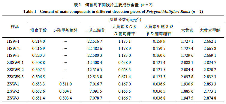 2.2.2 對(duì)照品溶液的制備 精密稱定沒(méi)食子酸、5-羥甲基糠醛、二苯乙烯苷、大黃素-8-O-β-D-葡萄糖苷、大黃素甲醚-8-O-β-D-葡萄糖苷、大黃素、大黃素甲醚對(duì)照品各適量,分別加80%甲醇制成質(zhì)量濃度分別為57.6、68.4、625.0、50.2、8.6、180.0、0.216 μg/mL的對(duì)照品溶液,即得。 2.2.3 供試品溶液的制備 取何首烏飲片粉末(過(guò)40目篩)約1 g,精密稱定,置平底燒瓶中,精密加入80%甲醇25 mL,密塞,稱定質(zhì)量,加熱回流提取30 min,放冷,密塞,再稱定質(zhì)量,用80%甲醇補(bǔ)足減失的質(zhì)量,搖勻,經(jīng)微孔濾膜(0.45 μm)濾過(guò),即得。 2.2.4 線性關(guān)系考察 分別精密吸取對(duì)照品溶液1、5、10、15、20、25 μL,注入液相色譜儀,按“2.2.1”項(xiàng)下色譜條件測(cè)定,以對(duì)照品質(zhì)量濃度為橫坐標(biāo)(X),峰面積為縱坐標(biāo)(Y)繪制標(biāo)準(zhǔn)曲線,并計(jì)算得到回歸方程與線性范圍,結(jié)果分別為沒(méi)食子酸Y=28 655.693 5 X-3 449.895 2,R2=1.000 0,線性范圍5.76~144.00 mg/L;5-羥甲基糠醛Y=78 294.955 3 X+11 679.404 8,R2=1.000 0,線性范圍6.84~171.00 mg/L;二苯乙烯苷Y=16 640.258 1 X+12 599.471 0,R2=0.999 9,線性范圍62.50~1 562.50 mg/L;大黃素-8-O-β-D-葡萄糖苷Y=30 743.247 5 X-9 558.630 6,R2=0.999 9,線性范圍5.02~125.50 mg/L;大黃素甲醚-8-O-β-D-葡萄糖苷Y=27 693.578 4 X-241.880 6,R2=1.000 0,線性范圍0.86~21.50 mg/L;大黃素Y=34 965.433 1 X-22 341.082 3,R2=0.999 9,線性范圍18.00~450.00 mg/L;大黃素甲醚Y=37 991.286 3 X+8 456.727 4,R2=1.000 0,線性范圍21.60~540.00 mg/L;結(jié)果表明,各對(duì)照品在各自范圍內(nèi)線性關(guān)系良好。 2.2.5 精密度試驗(yàn) 精密吸取供試品溶液(ZSW-1)10 μL,重復(fù)進(jìn)樣6次,按“2.2.1”項(xiàng)下色譜條件測(cè)定,6次測(cè)定結(jié)果顯示,沒(méi)食子酸、5-羥甲基糠醛、二苯乙烯苷、大黃素-8-O-β-D-葡萄糖苷、大黃素甲醚-8-O-β-D-葡萄糖苷、大黃素、大黃素甲醚峰面積的RSD分別為0.17%、0.39%、0.31%、0.54%、1.64%、0.21%、0.63%,表明儀器精密度良好。 2.2.6 穩(wěn)定性試驗(yàn) 精密吸取供試品溶液(ZSW-1)10 μL,分別于制備后0、2、4、8、12、24 h進(jìn)樣共6次,按“2.2.1”項(xiàng)下色譜條件測(cè)定,結(jié)果沒(méi)食子酸、5-羥甲基糠醛、二苯乙烯苷、大黃素-8-O-β-D-葡萄糖苷、大黃素甲醚-8-O-β-D-葡萄糖苷、大黃素、大黃素甲醚峰面積的RSD分別為0.52%、0.82%、0.36%、1.38%、1.54%、0.39%、0.90%,表明供試品溶液在24 h內(nèi)保持穩(wěn)定。 2.2.7 重復(fù)性試驗(yàn) 取制何首烏粉末(ZSW-1)約1 g,精密稱定,共6份,按“2.2.3”項(xiàng)下方法制備供試品溶液,分別精密吸取10 μL,注入液相色譜儀,按“2.2.1”項(xiàng)下色譜條件測(cè)定,記錄峰面積并計(jì)算各成分含量,結(jié)果沒(méi)食子酸、5-羥甲基糠醛、二苯乙烯苷、大黃素-8-O-β-D-葡萄糖苷、大黃素甲醚-8-O-β-D-葡萄糖苷、大黃素、大黃素甲醚含量的RSD分別為0.33%、0.92%、0.08%、1.65%、1.67%、1.59%、1.90%,表明該方法重復(fù)性良好。 2.2.8 加樣回收率試驗(yàn) 精密稱定已測(cè)定指標(biāo)成分含量的何首烏粉末(ZSW-1)約0.5 g,共6份,置平底燒瓶中,分別加入對(duì)照品適量,按“2.2.3”項(xiàng)下方法制備供試品溶液。精密吸取上述樣品與對(duì)照品溶液各10 μL,注入液相色譜儀,按“2.2.1”項(xiàng)下色譜條件進(jìn)行測(cè)定,記錄峰面積并計(jì)算加樣回收率,沒(méi)食子酸、5-羥甲基糠醛、二苯乙烯苷、大黃素-8-O-β-D-葡萄糖苷、大黃素甲醚-8-O-β-D-葡萄糖苷、大黃素、大黃素甲醚的平均加樣回收率分別為98.88%、97.99%、97.32%、102.85%、108.12%、96.67%、99.33%,RSD分別為0.36%、0.74%、0.33%、0.74%、0.93%、0.43%、1.16%,均符合《中國(guó)藥典》2020年版規(guī)定標(biāo)準(zhǔn)。 2.2.9 樣品測(cè)定 分別稱取生何首烏、九蒸九曬何首烏、藥典法制何首烏飲片適量,按“2.2.3”項(xiàng)下方法制備供試品溶液,每個(gè)樣品平行2次,按“2.2.1”項(xiàng)下色譜條件進(jìn)行測(cè)定,記錄峰面積并計(jì)算各成分含量,結(jié)果見(jiàn)表1。含量測(cè)定結(jié)果表明,何首烏不同飲片中均含有沒(méi)食子酸、二苯乙烯苷、大黃素-8-O-β-D-葡萄糖苷、大黃素甲醚-8-O-β-D-葡萄糖苷、大黃素、大黃素甲醚6種成分,但不同飲片間各成分含量存在一定差異。九蒸九曬、藥典法制何首烏中沒(méi)食子酸及蒽醌苷元類(lèi)成分的含量與生何首烏相比,均有不同程度的增加,其中以沒(méi)食子酸含量增加最為顯著,藥典法制何首烏約為生品的3倍,九蒸九曬何首烏約為生品的2倍。炮制為制何首烏后,苷類(lèi)(二苯乙烯苷、蒽醌苷)成分含量顯著減少,與生何首烏相比,九蒸九曬何首烏中二苯乙烯苷含量減少了約44%,蒽醌苷類(lèi)成分含量減少了約41%;藥典法制何首烏中二苯乙烯苷含量減少了約69%,蒽醌苷類(lèi)成分含量減少了約85%;而5-羥甲基糠醛僅在藥典法制何首烏飲片中檢出,平均質(zhì)量分?jǐn)?shù)為0.506 1 mg/g。