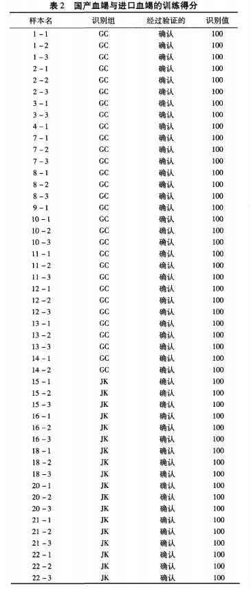 如圖 1所示 ,電子鼻將國產(chǎn)血竭樣品與進口血竭樣品分成了兩個區(qū)域 ,紅色區(qū)域為國產(chǎn)血竭 ,兩種不同的血竭樣品的差別主要表現(xiàn)在判別因子 1(100),進口血竭落在了Y軸的左側(cè) ,國產(chǎn)血竭落在了Y軸的右側(cè)。訓(xùn)練得分表明所用樣品均經(jīng)過確認 ,且識別值均為 100分 。由 DFA判別模型可基本知曉國產(chǎn)血竭和進口血竭在氣味上有著一定的區(qū)別 。訓(xùn)練得分如表 2所示。