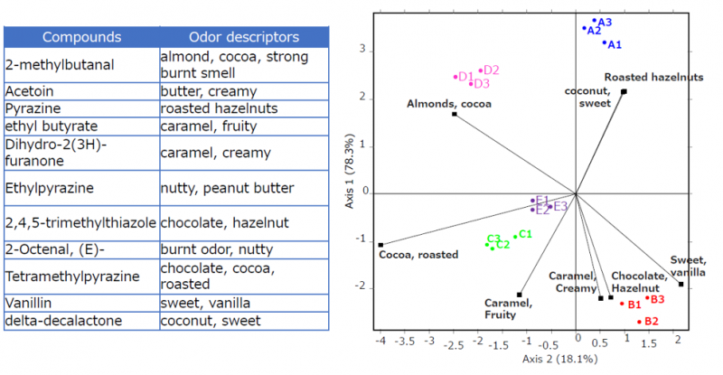 通過TDS持續(xù)時間生成的主成分分析圖:A,B,C,D,E 這幾個樣品都有不同的感官特征,比如A產品的榛子味濃一些,C產品的烤可可味更濃一些。