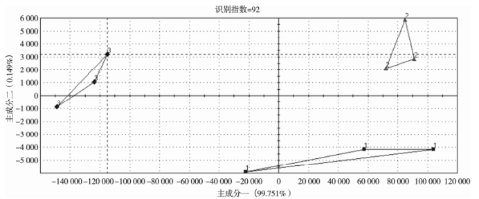 結(jié)果與分析 不同發(fā)酵方式柿子酒揮發(fā)性香氣成分分析 電子鼻對不同發(fā)酵方式柿子酒進(jìn)行主成分分析 由圖1可知,第一主成分對數(shù)據(jù)信息貢獻(xiàn)率為99.751%,第二主成分貢獻(xiàn)率為0.149%,兩個主成分的總貢獻(xiàn)率為99.900%,表明此圖譜能夠較好地反應(yīng)所測樣品中氣味數(shù)據(jù)的完整性。識別指數(shù)為92,在80~100之間,表示該數(shù)據(jù)區(qū)分分析結(jié)果為有效結(jié)果,識別指數(shù)值越大,區(qū)分效果越佳。