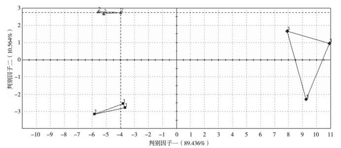 圖2 不同發(fā)酵方式柿子酒的主成分分析三維圖 電子鼻對不同發(fā)酵方式柿子酒進(jìn)行判別因子分析 由圖3可知,第一區(qū)分指數(shù)達(dá)到89.44%,第二區(qū)分指數(shù)達(dá)到10.56%,二者累計區(qū)分指數(shù)合計達(dá)到100%,說明判別因子分析能夠更好地顯示3種發(fā)酵方式柿子酒間的差異。從圖3還可以看出,皮渣發(fā)酵和清汁發(fā)酵的香氣成分差異較小,果漿發(fā)酵與皮渣發(fā)酵和清汁發(fā)酵樣品間的香氣成分差異較大。