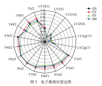 四個(gè)部位電子鼻氣味指紋雷達(dá)圖3表明:樣品HT在P10/1、P10/2、P40/1與其他樣品出現(xiàn)差異,P型傳感器一般對(duì)極性化合物和非極性化合物敏感;樣品HT與QT在T40/2、T40/1、TA/2區(qū)分較為明顯,而T型傳感器對(duì)氧化氣體和含硫化合物敏感,說(shuō)明在含硫化合物含量上樣品HT與樣品QT差異較大。