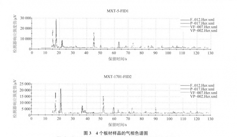 氣相色譜電子鼻系統(tǒng)采用2根不同極性的色譜柱:MXT~5(弱極性)和MXT~1701(中等極性)。圖3 為4個板材樣品的氣相色譜圖,從圖中可以看出,4個樣品的峰在出峰時間和峰的面積上都存在差別,即4 種板材樣品在氣味的化學(xué)成分上可能存在較大區(qū)別。