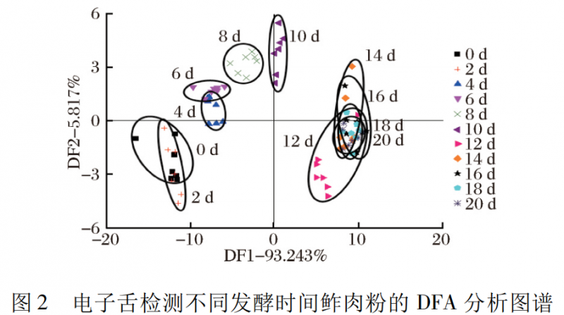 由圖 2 中 DFA 圖譜可知第一主成分貢獻率為93.243% ,第二主成分貢獻率為5. 817% ,2 種主要成分累積貢獻率為 99.06% ( 超過 85% ) ,說明 2 種主成分包括鲊肉粉滋味物質(zhì)的大部分信息。從 DFA 圖譜中看出,第 0 ~ 10 天,鲊肉粉發(fā)酵規(guī)律同 PCA 圖譜類似,但從第 12 ~ 16 天,鲊肉粉從左下方向右上方移動且小部分與第 18 天和第 20 天重疊,說明發(fā)酵中期隨時間的改變鲊肉粉的滋味物質(zhì)也有所改變且不同于發(fā)酵后期,從第 18 天和第 20 天樣品重疊在一起,說明發(fā)酵后期鲊肉粉產(chǎn)生的滋味物質(zhì)逐漸趨于穩(wěn)定。