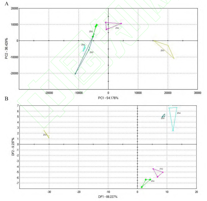 5種抓飯電子鼻檢測(cè)主成分分析PCA結(jié)果如圖1所示,第1主成分區(qū)分貢獻(xiàn)率為54.178%,第2主成分區(qū)分貢獻(xiàn)率為38.429%,2個(gè)主成分累計(jì)貢獻(xiàn)率92.607%,總貢獻(xiàn)率超過(guò)85%表明試驗(yàn)方法的可行性,說(shuō)明PC1和PC2兩軸包含了PCA轉(zhuǎn)換中絕大部分的貢獻(xiàn)率,主要成分可以較好地反映原來(lái)多指標(biāo)的信息。ZS4和ZS5判別指數(shù)為7.4%,表明這兩個(gè)抓飯的香氣高度相似。判別因子分析DFA分析可知,不同抓飯?jiān)贒FA圖中分別有各自的區(qū)域并且沒(méi)有重疊。其中主成分1(DF1)的貢獻(xiàn)率達(dá)到了88.227%,主成分2(DF2)的貢獻(xiàn)率達(dá)到了9.237%,主成分1(DF1)和主成分2(DF2)的累積方差貢獻(xiàn)率為97.464%,包含了樣品絕大部分信息,說(shuō)明用DFA來(lái)表示電子鼻整體信息非常可信。電子鼻結(jié)合DFA可以很好地區(qū)分5種市售抓飯。