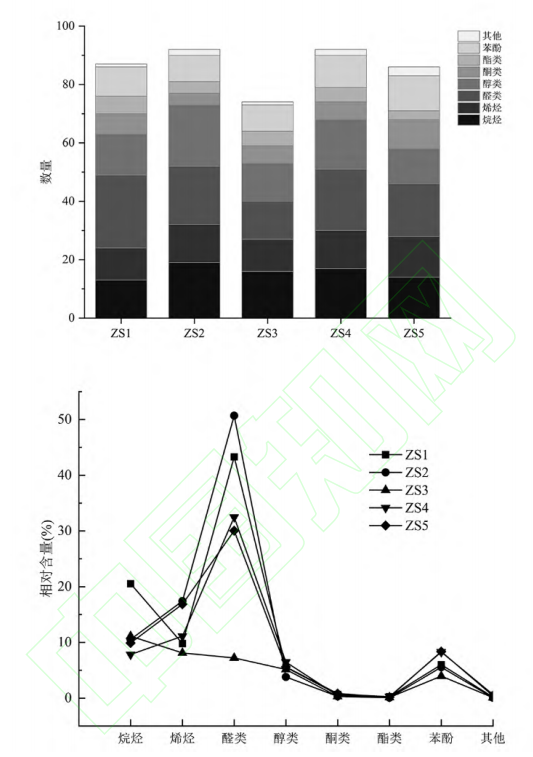 GC-MS檢測(cè)揮發(fā)性物質(zhì)種類(lèi)與含量 5種市售抓飯共鑒定出132種化合物,其中包括烷烴(25種)、烯烴(16種)、醛類(lèi)(27種)、醇類(lèi)(26種)、酮類(lèi)(11種)、酯類(lèi)(9種)、苯酚類(lèi)(15種)、其它(3種)。從圖4可以看出,ZS1鑒定出87種,其中醛類(lèi)(43.31%)、烷烴(20.54%)相對(duì)含量較高;ZS2鑒定出92種,其中醛類(lèi)(50.68%)、烯烴(17.41%)、烷烴(10.53%)相對(duì)含量較高;ZS3鑒定出74種,其中烷烴(11.11%)、烯烴(8.11%)相對(duì)含量較高;ZS4鑒定出92種,其中醛類(lèi)(32.47%)、烯烴(11.12%)相對(duì)含量較高;ZS5鑒定出86種,其中醛類(lèi)(30.04%)烯烴(16.85%)相對(duì)含量較高。