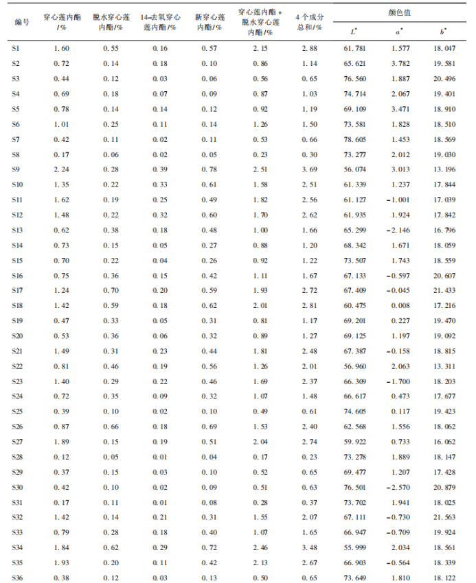 實(shí)驗(yàn)采用HPLC對(duì)穿心蓮中4個(gè)主要有效成分進(jìn)行定量分析,應(yīng)用電子眼對(duì)穿心蓮粉末進(jìn)行顏色采集,根據(jù)樣品的顏色數(shù)據(jù)進(jìn)行主成分分析;在此基礎(chǔ)上,引入色度空間系統(tǒng)參數(shù)L*(明度值),a*(紅綠分量值)和b*(黃藍(lán)分量值),特征性量化描述樣品顏色,并與穿心蓮有效成分含量進(jìn)行相關(guān)性分析,考察顏色與內(nèi)在質(zhì)量的相關(guān)性。