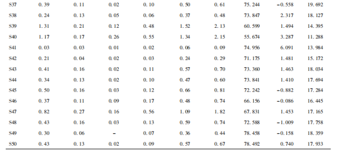 取穿心蓮藥材共50批,使用高效液相色譜儀測(cè)定,計(jì)算穿心蓮中各指標(biāo)成分的含量,見(jiàn)表3。結(jié)果發(fā)現(xiàn)收集部位為莖的4個(gè)成分總和的質(zhì)量分?jǐn)?shù)處于0.09%~0.81%;收集部位為地上部分的4個(gè)成分總和的質(zhì)量分?jǐn)?shù)處于0.74%~3.48%;收集部位為葉的4個(gè)成分總和的質(zhì)量分?jǐn)?shù)處于1.66%~3.69%。