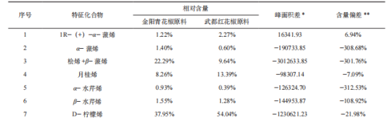 花椒作物在我國很多地區(qū)都有種植,花椒的揮發(fā)油是花椒香氣的主要來源,也是反映花椒香氣的主要指標(biāo),花椒中揮發(fā)油的含量及組成成分不僅受到花椒品種、產(chǎn)地環(huán)境因子(如產(chǎn)地氣候、雨量、日照時(shí)間、土質(zhì)等)的影響,還受到提取加工方法、提取部位和采收時(shí)期等外在因素的影響。 超快速氣相電子鼻技術(shù)具有分析速度快、靈敏度高和檢測(cè)費(fèi)用低等優(yōu)點(diǎn)。超快速氣相電子鼻將雙快速氣相色譜檢測(cè)與基于多變量統(tǒng)計(jì)的強(qiáng)大數(shù)據(jù)處理和感官及化學(xué)表征(Arochembase)的可選模塊相結(jié)合,利用超快速氣相電子鼻技術(shù),解析不同品種花椒及花椒提取物揮發(fā)性化合物,通過主成分分析建立產(chǎn)品有效判別模型,同時(shí)解析花椒物質(zhì)構(gòu)成。 不同產(chǎn)地花椒原料、花椒精油產(chǎn)品、花椒油產(chǎn)品、nC6-nC16標(biāo)準(zhǔn)溶液。 超快速氣相電子鼻;零空氣發(fā)生器;氫氣發(fā)生器;20mL頂空進(jìn)樣瓶,電子天平。 花椒:取0.2g花椒顆粒于20mL頂空進(jìn)樣瓶中,迅速加蓋密封檢測(cè),設(shè)置3個(gè)平行樣品,降低檢測(cè)誤差。 花椒精油:將花椒精油搖晃均勻后,取20uL于20mL頂空進(jìn)樣瓶中,加蓋密封檢測(cè),每個(gè)樣品設(shè)置3個(gè)平行樣。 花椒油:將花椒油搖晃均勻后,使用電子天平稱取0.1g于20mL頂空進(jìn)樣瓶中,加蓋密封檢測(cè),設(shè)置3個(gè)平行樣品。 花椒原料:樣品量0.2g,進(jìn)樣體積500uL,孵化溫度80℃,孵化時(shí)間20min,50℃恒溫30s,1℃/s速率升溫至80℃恒溫30s,3℃/s速率升溫至125℃恒溫10s,3℃/s速率升溫至250℃恒溫11s。 花椒精油:取樣量100μL,捕集溫度40℃,孵化溫度60℃,孵化時(shí)間10min,載氣流量30mL/min;進(jìn)樣量1000uL,進(jìn)樣口溫度200℃,閥溫度為250℃;FID溫度260℃,升溫程序:初始溫度45℃,保持35s,1.0℃/s升至70℃,保持30s,0.5℃/s升至140℃,3.0℃/s升至250℃,保持21s,采集時(shí)間共計(jì)288s。花椒油:取樣量0.1g,捕集溫度40℃,孵化溫度60℃,孵化時(shí)間20min,載氣流量30mL/min;進(jìn)樣量500uL,進(jìn)樣口溫度200℃,閥溫度為260℃,F(xiàn)ID溫度為260℃,升溫程序:初始溫度50℃,保持30s,1.0℃/s升至85℃,保持30s,1.0℃/s升至125℃,保持10s,3.0℃/s升至250℃,保持10s,采集時(shí)間共計(jì)197s。 將裝有樣品的頂空小瓶按照順序依次放入樣品盤,每3個(gè)平行樣品后面放入一個(gè)空瓶,目的是為了消除樣品帶來的信號(hào)干擾,選擇程序進(jìn)行樣品分析。 使用Heracles超快速氣相電子鼻自帶軟件Alphasoft進(jìn)行樣品數(shù)據(jù)處理,明確揮發(fā)性風(fēng)味物質(zhì)種類與含量。 利用正構(gòu)烷烴標(biāo)準(zhǔn)溶液(nC6-nC16)進(jìn)行校準(zhǔn),進(jìn)行保留時(shí)間與保留參數(shù)之間的轉(zhuǎn)換,利用超快速氣相電子鼻自帶數(shù)據(jù)庫AroChembase數(shù)據(jù)庫對(duì)樣品中的成分進(jìn)行定性分析,采用峰面積歸一法對(duì)目標(biāo)化合物進(jìn)行定量分析,確定各香氣成分相對(duì)含量。 采用正構(gòu)烷烴標(biāo)準(zhǔn)溶液(nC6-nC16)對(duì)檢測(cè)方法進(jìn)行校準(zhǔn),結(jié)合超快速氣相電子鼻自帶AroChembase數(shù)據(jù)庫對(duì)樣品中主要揮發(fā)性成分進(jìn)行定性分析,推測(cè)得到匹配度高的化合物。 通過對(duì)比色譜圖(圖1)發(fā)現(xiàn),樣品間的出峰時(shí)間及出峰位置基本一致,峰面積間存在差異,說明樣品中揮發(fā)性成分的種類基本一致,含量上存在略微差異。 青花椒原料中共分析出11種含量較高成分,紅花椒原料中共分析出13種含量較高成分,乙酸芳樟酯與乙酸香葉酯在青花椒中未曾檢測(cè)出。通過計(jì)算,可知青、紅花椒不僅成分種類上有差異,各成分含量上同樣差異明顯。除1R-(+)-α-蒎烯、1,8桉葉素、乙酸芳樟酯、乙酸香葉酯外,其他成分均是青花椒中含量較紅花椒高。其中,青紅花椒原料中芳樟醇含量差別最大,差異最為明顯,D-檸檬烯含量差別較大,但相對(duì)偏差不大,推斷不是造成青紅花椒風(fēng)味不同的主要差異。乙酸芳樟酯、乙酸香葉酯僅存在于紅花椒原料中,由此可利用花椒原料產(chǎn)品中芳樟醇、乙酸芳樟酯、乙酸香葉酯含量區(qū)分花椒原料種類。 表1 武都紅花椒、金陽青花椒原料特征化合物相對(duì)含量與峰面積差異 青花椒精油中共分析出11種含量較高成分,紅花椒精油中共分析出13種含量較高成分,乙酸芳樟酯與乙酸香葉酯在青花椒中未曾檢測(cè)出,與原料表現(xiàn)一致。通過計(jì)算峰面積差值和含量偏差可知,乙酸芳樟酯等酯類物質(zhì)僅存在于紅花椒中。1R-(+)-α-蒎烯、月桂烯、D-檸檬烯、1,8桉葉素在紅花椒精油中含量較高,其他組分在青花椒精油中含量較高,和原料情況不一致,可能和提取工藝有關(guān)。其中芳樟醇含量差別最大,差異最為明顯,乙酸芳樟酯、乙酸香葉酯僅存在于紅花椒精油產(chǎn)品中,由此可利用花椒精油產(chǎn)品中檜烯、β-蒎烯、芳樟醇含量和乙酸芳樟酯、乙酸香葉酯等酯類物質(zhì)存在與否來區(qū)分花椒精油種類。 表2 武都紅花椒精油、金陽青花椒精油特征化合物相對(duì)含量與峰面積差異