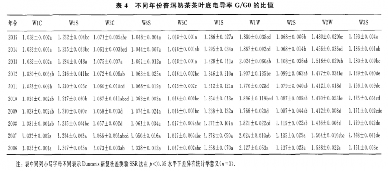 表 2至表 4為 10 個不同年份普洱熟茶的干茶、茶湯和葉底的具體的電導(dǎo)率 G/GO值。從表 2可知,對干茶香氣 G/GO值最大的傳感器是 w1w 和 W1S,其次是 w2w 和 W2S,其他 6個傳感器的 G/GO值較低;對茶湯香氣 G/GO值最大的傳 感器是 w1w 和 w2w ,其次是 W1S和 W5S,其他 6個傳感器的 G/GO值較低(表 3);葉底香氣 G/G0值的貢獻率大小順序與茶湯的相同,即為傳感器 w1w>w2w >w1s>w 5s(表4)。由表1所示的10個傳感器的性能可知,W1S傳感器對甲烷類揮發(fā) 性成分敏感,w1w ,w2w ,W2S和W 5S分別對硫化物,芳香成分、有機硫化物 ,乙醇和氮氧化合物等揮發(fā)性成分敏感。另外,不同年份普洱熟茶的香氣物質(zhì)不論 是干茶 、茶湯和葉底在其組成上基本一致 ,只是在干茶中乙醇?xì)怏w比和氮氧化合 物更為豐富。總體來看,上述幾類揮發(fā)性成分的含量在干茶中含量最高,茶湯次之 ,葉底最低;其中2011年干茶對 w 1s,w1w ,w2w ,W2S和 W5S傳感器的電導(dǎo)率基本上是所有茶樣中最高的。隨著貯藏年份的增加,上述幾類揮發(fā)性成分的含量 在干茶和茶湯中呈顯著的上升趨勢,在葉底中呈顯著的下降趨勢。