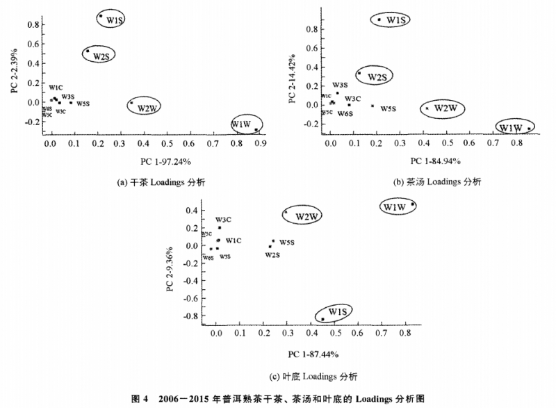 本研究中的Loadings分析法主要是對傳感器進行研究,利用該方法可以確認(rèn)特定試 驗樣品下各傳感器對樣品區(qū)分的貢獻率大小,從而考察在樣品區(qū)分過程中哪一類氣 體起了主要區(qū)分作用。干茶的 Loadings分析結(jié)果如圖 4a,傳感器 w1w (對硫化物 敏感 )的位點距離x=0最遠(yuǎn),說 明 W1W 對第一主成分的貢獻率最大,傳感器 W2W (對芳香成分 、有機硫化物靈敏 )次之;而傳感器W1s(對甲烷敏感 )的位點距離 y=0最遠(yuǎn),說明其對第二主成分貢獻率最大,傳感器 w2s(對乙醇敏感 )次之。茶湯的 Loadings分析結(jié)果如圖 4b,傳感器對主成分的貢獻率與干茶的完全相同,即 w1w 對第一主成分的貢獻率最大,傳感器 w2w 次之;而傳感器 w1S對第二主成分貢獻 率最大,傳感器 W2S次之。葉底的 Loadings分析結(jié)果如圖 4c,傳感器 w1w 的位 點距 x=0和 y=0都較遠(yuǎn),說明其對第一、第二主成分的貢獻都較大,而 w2w 距y=0最遠(yuǎn),說明其對第二主成分貢獻率最大,傳感器 w1s對第一主成分的貢獻次于 w1w。