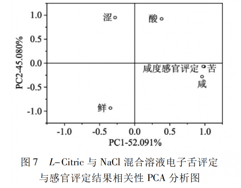 對L-Citric與 NaCl 混合溶液的感官咸度評分和電子舌所測得的咸、酸、苦、澀、鮮五組數(shù)據(jù)進行主成分分析。如圖 7 所 示,PC1 和 PC2 累積方差貢獻率為97.981%,“感官咸度評分”和電子舌數(shù)據(jù)“咸”在圖上位置相近,說明電子舌對溶液咸度的評分“咸”與感官咸度評分相關(guān)性較高。在 PCA 分析圖上,“感官咸度評分”除了與電子舌數(shù)據(jù)“咸”在圖上位置相近之外,還與電子舌數(shù)據(jù)“苦”有著非常近的距離。文中主要研究的是兩種方式對溶液咸度的評定,而沒有將苦味的感官評定和電子舌評定進行比較。在L-Citric與 NaCl 混合溶液味道的電子舌評定中,“苦”味可能受到其他味道的干擾而判斷有誤,導(dǎo)致其在 PCA 圖上與“感官咸度評分”相距很近,但不影響對“感官咸度評分”和“咸”之間相關(guān)性的分析。