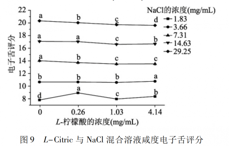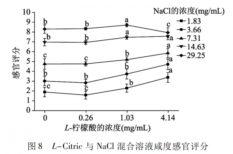 圖8 是 L-Citric 與 NaCl 混合溶液咸度的感官評定結(jié)果。在相同的氯化鈉濃度水平下,添加 0.26 mg /mL L-檸檬酸的混合溶液與氯化鈉溶液的咸度沒有顯著差異( p > 0.05) ,添加 1.03、4.14 mg /mL L-檸檬酸的混合溶液的咸度則顯著高于氯化鈉溶液的咸度( p <0.05) ; 但是在 29.25 mg /mL 氯化鈉濃度下添加4.14 mg /mL L-檸檬酸時,混合溶液的咸度則受到抑制,不同的味道在口中具有不同的傳導(dǎo)途徑,當氯化鈉和檸檬酸的濃度過高時,檸檬酸會對氯化鈉的味覺傳導(dǎo)途徑產(chǎn)生影響,阻礙了氯化鈉咸度的感知。