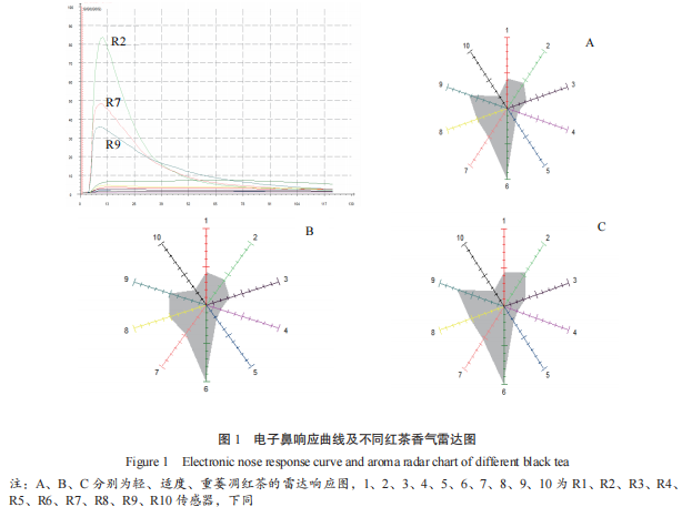 選取適度萎凋的響應(yīng)曲線,即從圖中可以看出初始階段,R2、R7、R9 號傳感器的響應(yīng)值較高,其他的較為平緩,并且 R2、R7、R9 號響應(yīng)值也隨時(shí)間的延長,出現(xiàn)平緩的趨勢。由電子鼻響應(yīng)曲線圖中可以看出在 T=118 s 開始各傳感器響應(yīng)曲線逐漸趨于平穩(wěn),因此選取 T=120 s 時(shí)的穩(wěn)態(tài)響應(yīng)值作為分析點(diǎn)建立雷達(dá)圖,根據(jù)各傳感器對不同類物質(zhì)的敏感程度,其響應(yīng)值越高表明該類物質(zhì)濃度越高。由圖 1 可知,在三種萎凋方式的紅茶香氣雷達(dá)響應(yīng)圖中,對紅茶香氣敏感的傳感器有 R6、R9、R8、R7、R1和 R2,表明該三組紅茶香氣中烷類、醇類、芳香成分和有機(jī)硫化物、氨氧化合物含量較高。