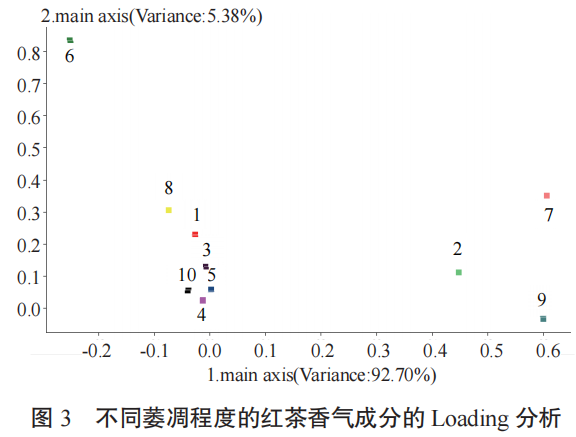 Loadings 分析,反映的是不同傳感器在紅茶香氣的區(qū)分中其貢獻(xiàn)的大小,一般通過傳感器在圖中的位置來判斷其貢獻(xiàn)的大小。傳感器與原點(diǎn)的距離越近,說明傳感器對樣品分析起到的作用越小,反之則表示作用越大。由圖 3 可得第一主成分起主要作用,這和 PCA 分析所得結(jié)論相同,R7 和 R9 傳感器對第一主成分貢獻(xiàn)率最大,R2 次之;R6 傳感器對第二主成分貢獻(xiàn)率最大,R8 次之。R4、R5、R10 傳感器負(fù)載較低,表明其對茶葉香氣成分敏感度較低。Loadings 分析表明在不同萎凋程度的紅茶區(qū)分中硫化物、芳香型化合物、氮氧化合物以及烷類、醇類化合物對區(qū)分貢獻(xiàn)有主要作用。