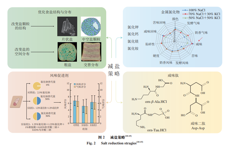 要達(dá)到“減鹽不減咸”的目的,可以基于以上咸味傳導(dǎo)途徑的特點(diǎn),從多方面、多角度減少Na+過(guò)量攝入。如通過(guò)設(shè)計(jì)食物中Na+分布等,提高咀嚼過(guò)程中Na+在口腔中的釋放速率;或者使用非Na+的金屬鹽代替NaCl作為咸味調(diào)味品;除此之外,還可使用非離子型的風(fēng)味促進(jìn)劑,如咸味香精、咸味肽等提高咸味的感知。目前常見的減鹽策略如圖2所示。