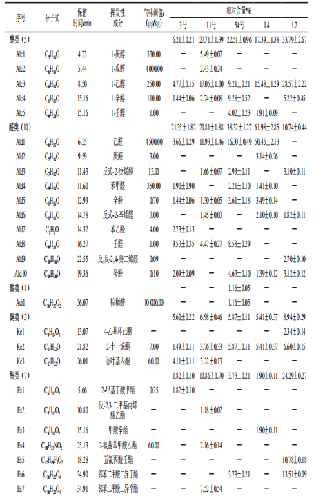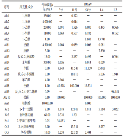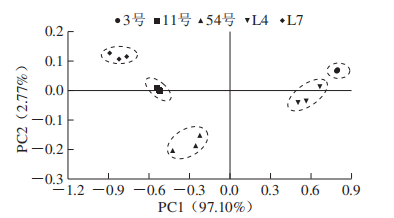金針菇品種繁多,并且各種新品種不斷研發(fā)栽培。不同品種金針菇的生長(zhǎng)特性、出菇特性、商品性狀和生物轉(zhuǎn)化率不同,而風(fēng)味物質(zhì)也存在各自的差別和獨(dú)特之處。本研究采用SPME-GC-MS和電子鼻分析5個(gè)品種金針菇揮發(fā)性物質(zhì),由定量分析、PCA、HCA探究不同品種金針菇揮發(fā)性物質(zhì)差異,并通過(guò)SPME-GC-MS結(jié)合電子鼻進(jìn)行PCA對(duì)比品種鑒定準(zhǔn)確率。 5個(gè)金針菇樣品組(3號(hào)、11號(hào)、54號(hào)、L4和L7),測(cè)定前將樣品用液氮研磨。 GC-MS聯(lián)用儀;FOX3000型電子鼻。 金針菇風(fēng)味化合物SPME-GC-MS檢測(cè) 用液氮研磨后,準(zhǔn)確地稱量2.0g金針菇樣品于20mL頂空瓶中。將DVB/CAR/PDMS型萃取頭在250℃活化20min后,在60℃水浴中進(jìn)行靜態(tài)吸附萃取40min,將萃取頭放入GC進(jìn)樣口解吸。 以正構(gòu)烷烴的實(shí)際測(cè)量值校正保留時(shí)間,SPME-GC-MS測(cè)定結(jié)果通過(guò)NIST98數(shù)據(jù)庫(kù)(NIST08,華盛頓特區(qū))進(jìn)行檢索,取匹配度80%以上的揮發(fā)性成分;以2-氯苯甲醛為內(nèi)標(biāo)物對(duì)各化合物進(jìn)行定量分析。 用液氮研磨后,精確稱取2.0g金針菇樣品于20mL頂空瓶?jī)?nèi)。樣品測(cè)量流速150mL/min,檢測(cè)時(shí)間120s。電子鼻配備12個(gè)不同的氣體傳感器:LY2/LG、LY2/G、LY2/AA、LY2/GH、LY2/gCTL、LY2/gCT、T30/1、P10/1、P10/2、P40/1、T70/2和PA/2,通過(guò)傳感器陣列響應(yīng)和模式識(shí)別技術(shù)對(duì)揮發(fā)性氣體分子進(jìn)行分析。 特征揮發(fā)性物質(zhì)的評(píng)定 利用相對(duì)氣味活度值(relativeodoractivityvalue,ROAV)評(píng)定各揮發(fā)性化合物對(duì)樣品總體氣味的貢獻(xiàn),定義對(duì)樣品風(fēng)味貢獻(xiàn)最大的組分:ROAVstan=100,則其他揮發(fā)性化合物的ROAV小于100,按下式計(jì)算: