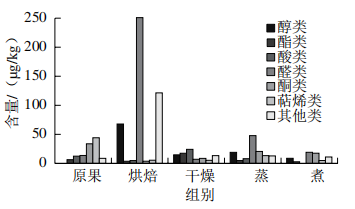 圖1表明,干燥后的揮發(fā)性物質(zhì)相對(duì)于原果都有一定幅度的減少,例如醇類、酯類、酸類、萜烯類減少是由于干燥后烯烴類遭到破壞,同時(shí)可以看到沙棗中的醛類物質(zhì)較多,尤其是在烘焙處理中含量最多,醛對(duì)棗果實(shí)的風(fēng)味有顯著影響。