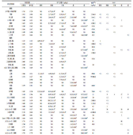 表2 不同預(yù)處理后沙棗中揮發(fā)性物質(zhì)含量及OAV
