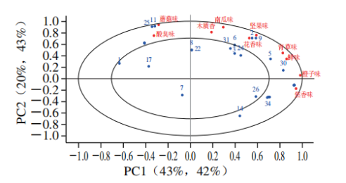 特征香氣強(qiáng)度相應(yīng)值與感官特征參數(shù)相關(guān)性分析結(jié)果 PLSR是一種基于因子的多元回歸將數(shù)據(jù)分解為不同PC,并建立預(yù)測(cè)校準(zhǔn)模型的方法。如圖6所示,位于同一象限的樣本之間相關(guān)性較強(qiáng),感官屬性與同象限變量相互接近,具有正相關(guān),與對(duì)角象限中的變量,具有負(fù)相關(guān)。PLSR模型解釋了63%的X變量和85%的Y變量。青草香、花香的屬性與壬醛(9)、2-壬酮(5)4-(2-呋喃基)-3-丁烯-2-酮(29)、壬醛(6)呈正相關(guān)、焦香的屬性與2,6-二甲基吡嗪(4)、糠醇(20)、2-吡咯甲醛(34)呈正相關(guān),與己酸(25)、庚酸(11)、1-辛烯-3-醇(10)呈負(fù)相關(guān),而這3種物質(zhì)對(duì)蘑菇味和酸臭味的屬性具有正向影響,這些與感官評(píng)價(jià)結(jié)果中的感官評(píng)分具有很好的一致性(圖2)。