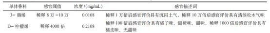 以53%的乙醇為基底逐級(jí)稀釋測(cè)定3-蒈烯、D-檸檬烯、檜烯、α-蒎烯、β-蒎烯、月桂烯、反式石竹烯嗅覺閾值并確定其感官描述詞。