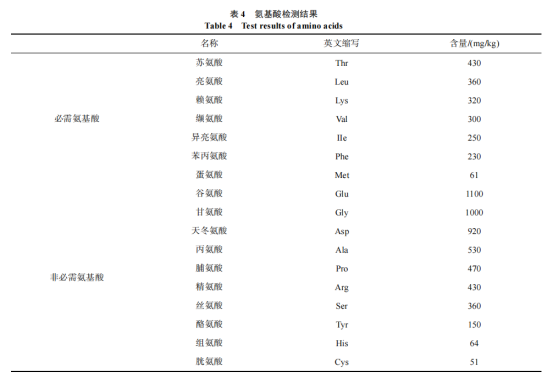 海參中含有 18 種氨基酸, 8 種為必需氨基酸, 本研究檢測了海參肽飲品中的 17 種氨基酸, 檢測結(jié)果見表 4。由表 4 可以看出, 本海參肽飲品中有 7 種必需氨基酸, 10 種非必需氨基酸, 17 種氨基酸總量為 7026 mg/kg。其中谷氨酸含量最高, 可達(dá)到 1100 mg/kg, 占氨基酸總量的 16%,谷氨酸是一種功能性氨基酸, 參與蛋白質(zhì)的合成和氧化供能, 具有抗氧化能力和促進(jìn)腸道發(fā)育的作用, 同時(shí)也是海參肽飲品中重要的鮮味物質(zhì)。其次是甘氨酸和天冬氨酸, 含量分別占氨基酸總量的 14%和 13%。甘氨酸參與體內(nèi)多種代謝過程, 在預(yù)防酒精性肝病和免疫調(diào)節(jié)等多種方面都發(fā)揮重要作用。胱氨酸、蛋氨酸與組氨酸含量最少,占氨基酸總量的 0.7%、0.9%和 0.9%, 其余氨基酸占比范圍在 2%~8%之間。另外測得海參肽飲品蛋白質(zhì)含量為7.05 mg/mL、脂肪含量為 0 mg/mL。說明此海參肽飲品含有豐富的蛋白質(zhì)與多種氨基酸, 營養(yǎng)價(jià)值豐富。