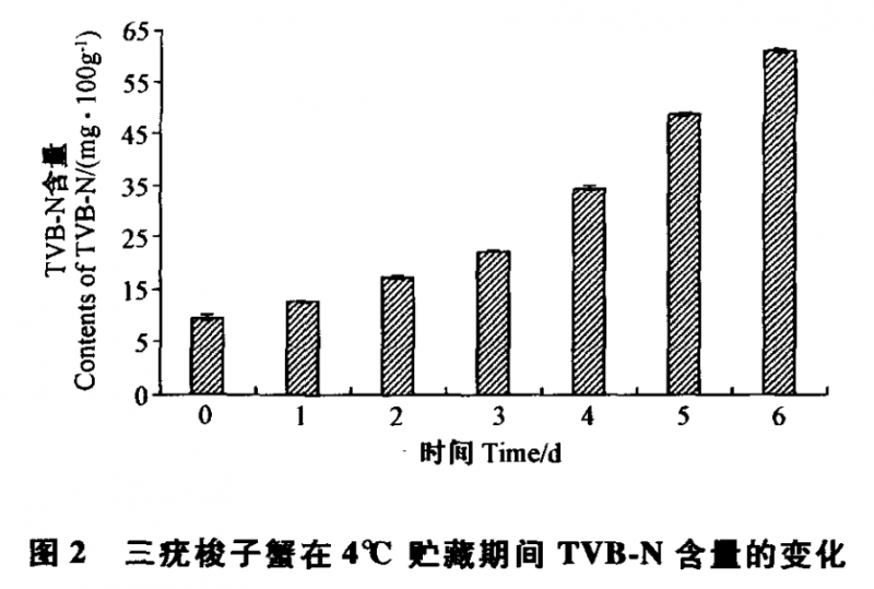 由圖 2可知,TVB-N 含量在貯藏初期變化緩慢,這是由于低溫 (4℃)和真空包裝條 件抑制了蟹肉中微生物的生長和繁殖,導致貯藏前期TVB-N含量增長緩慢 。從貯 藏第 4天開始TVB-N含量顯著上升,含量由34.44mg·100g-1 上升到貯藏第 6 天 的 60.76mg·l00g-1。GB2733—2005 規(guī)定新鮮海蟹的TVB-N含量值應低于 25mg·100g-1,貯藏第 3天蟹肉的TVB-N含量為 22.26mg·100g-1,仍屬于新鮮蟹 肉,貯藏第 4天蟹肉的TVB-N含量高于規(guī)定標準,已腐敗變質(zhì),由此表明 TVB-N 可 以反映蟹肉鮮度的變化 。