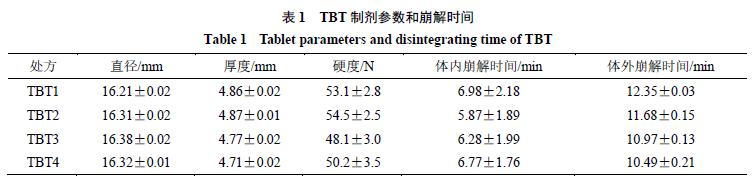 含片硬度、崩解時間的測定 采用游標卡尺測定TBT的厚度和直徑,片劑測試儀測量片劑的硬度。崩解時間的測定選取12名健康志愿者(20~30歲,來自成都中醫(yī)藥大學)評價。將片劑含于口腔內,直到片劑崩解完全,記錄時間,得到其體內崩解時間;將900 mL水加熱維持在(37.0±0.5)℃,作為崩解介質,采用崩解儀測定含片的體外崩解時間。TBT的基本制劑質量參數(shù)見表1。掩味后2種含片的外觀直徑略大于原片,厚度變小,可能是由于硬度變小所導致。4種含片的體內崩解時間與體外崩解時間差異較大,可能是由于人體測試過程中會不自主的摩擦攪拌含片,故崩解時間縮短。4種TBT的體外崩解時間均能滿足口含片不在10 min內全部崩解或溶化的要求。