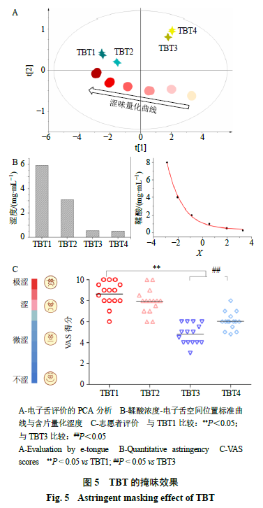 (2)感官分析驗證:采用視覺模擬量表法(visual analogue scale,VAS)進行評估。感官評價小組由來自成都中醫(yī)藥大學的健康志愿者(20~26歲,味覺正常,無抽煙、酗酒史)構成,實驗經過成都中醫(yī)藥大學附屬醫(yī)院倫理委員會(批準編號:2014KL016)審核批準。首先,采用酸(檸檬酸)、苦(奎寧)、甜(蔗糖)、咸(氯化鈉)、鮮(谷氨酸鈉)、澀(鞣酸)6種味覺溶液測試志愿者的味覺靈敏度;再用鞣酸溶液(0.062 5、0.125、0.25、0.5、1、2、4、8 mg/mL)訓練志愿者對澀味強度的認知,熟悉評價標準。最終,15名志愿者(5名男性和10名女性)參加TBT的澀味評估。志愿者將口含片置于口腔內,含服至無顆粒感,根據(jù)量表的標尺評分。樣品測試間隔,用純水沖洗口腔至無澀味感,并給予一定時間休息。
