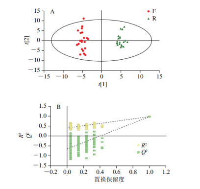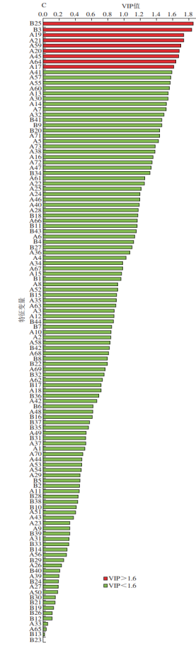 為了進(jìn)一步考察兩組紅茶的分類情況,進(jìn)行OPLS-DA。相較于PLS-DA,OPLS-DA添加了正交計算以消除與分類無關(guān)的信息,能有監(jiān)督地實(shí)現(xiàn)不同分組間樣品的有效分離?;贕C-E-Nose檢測的揮發(fā)性成分響應(yīng)峰面積數(shù)據(jù)集構(gòu)建OPLS-DA模型,其得分圖如圖1A所示,缺陷紅茶位于第2象限和第3象限,優(yōu)質(zhì)紅茶位于第1象限和第4象限,兩者分離趨勢明顯,模型R2Y=0.973,Q2=0.925,表明該模型具有較好的解釋能力和預(yù)測能力。置換檢驗(yàn)(n=200)中R2和Q2的截距分別為0.426和-0.865,Q2截距<0,說明該模型不存在過擬合(圖1B)。結(jié)果表明,GC-E-Nose結(jié)合多元統(tǒng)計分析可實(shí)現(xiàn)缺陷紅茶與優(yōu)質(zhì)紅茶快速區(qū)分。