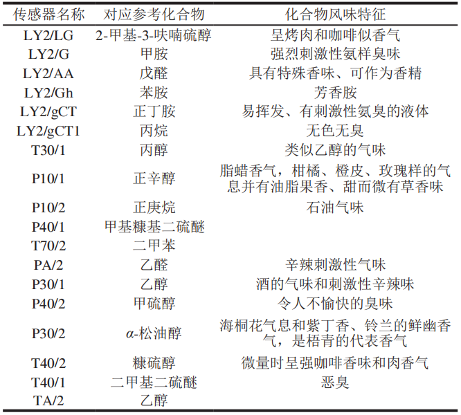 由圖2可知,電子鼻可以有效區(qū)分臨床乳房炎牛乳和健康牛乳樣品,PC1貢獻率達92.7%,可以很好地反映樣品的整體信息。電子鼻的18 個傳感器對兩種牛乳的風味化合物皆有響應,并且響應值各不相同。除LY2/LG傳感器響應強度差異不顯著,其余17 個傳感器對兩種牛乳的響應值均表現出顯著差異(P<0.05)。在健康牛乳中,T70/2、T40/2傳感器有顯著響應,對應香氣增加。在乳房炎牛乳中,P30/1、LY2/gCT、P40/2、LY2/G等傳感器具有顯著響應,對應的不愉快臭味增加。結合傳感器對應參考化合物的風味特征,由表2可知,奶?;既榉垦缀?,其分泌的乳汁不新鮮,存在一定的刺激性氣味,加工價值降低。