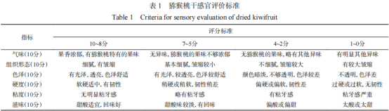 感官評價:參照《中華人民共和國農(nóng)業(yè)行業(yè)標準綠色食品干果》中 3.2 針對果干的感官要求 ,由20 名經(jīng)感官品評培訓的評價員組成評價小組(10 名女性,10 名男性,年齡在 22~34 歲之間),對獼猴桃干的氣味、組織形態(tài)、色澤、硬度、粘度、滋味進行感官評分,總分為 60 分,具體評分標準見表 1。