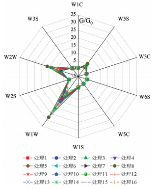 圖1是基于電子鼻技術(shù)對(duì)山櫻花16個(gè)處理的櫻花香氣組成成分響應(yīng)值構(gòu)建的雷達(dá)圖。從圖1可以看出,10個(gè)傳感器對(duì)櫻花香氣組分的響應(yīng)存在顯著差異(P<0.01),響應(yīng)值‘G/G0值’分布于0.9~29之間。W1C、W5S、W1S、W1W、W2W和W3S傳感器對(duì)櫻花香氣組分響應(yīng)值較大,響應(yīng)值從高到低依次為W1W、W2W、W5S、W1S、W3S、W1C,其余傳感器對(duì)櫻花香氣組分響應(yīng)值較?。℅/G0值≈1)。因此,優(yōu)選出W1C、W5S、W1S、W1W、W2W和W3S傳感器進(jìn)行數(shù)據(jù)提取與分析。