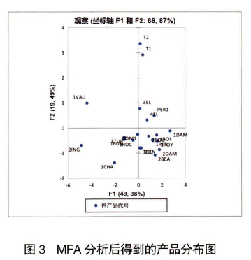 He等在報(bào)道中對腐乳進(jìn)行了多維度分析,包括由兩種感官分析方法獲得的感官數(shù)據(jù)(0DA和FP)、GC-MS靶標(biāo)揮發(fā)性化合物分析及物理性質(zhì)分析,MFA 在該文中被用于解釋這3類指標(biāo)之間的關(guān)系及物理化學(xué)指標(biāo)對感官的貢獻(xiàn)。陸龍建等運(yùn)用 MFA法對分類化學(xué)成分與感官評價(jià)結(jié)果進(jìn)行了綜合分析,并比較了采用化學(xué)成分和感官評價(jià)兩種方法剖析卷煙風(fēng)格特征時(shí)的一致性。