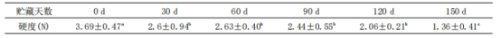 由表2可知,隨著凍藏時間的延長,紅燒肉的硬度持續(xù)降低,其中30d凍藏與新鮮的紅燒肉有顯著變化(P<0.05),30d至90d無顯著變化(P>0.05),而貯藏120d和150d與此前均有顯著變化(P<0.05)。凍藏30d,紅燒肉的硬度即明顯下降,凍藏150d自然解凍后的紅燒肉硬度下降至1.36N,這可能是因為凍藏過程中冰晶對肌細胞和肌肉纖維的破壞程度加重,引起豬肉中結(jié)合水和不易流動水的遷移與損失,從而引起紅燒肉質(zhì)構(gòu)品質(zhì)發(fā)生劣變。