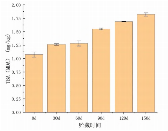 過氧化值是反映油脂氧化的重要指標,不同貯藏期的POV值如圖1所示。在-18℃條件下,預制紅燒肉的過氧化值隨貯藏時間增加而增長,其中只有60d和150d有明顯增加。不同貯藏時期的TBA反應物值如圖2所示,TBA值隨貯藏時間顯著上升(P<0.05),貯藏0d的MDA含量約為1.07mg/kg,貯藏150d后,MDA含量增加到1.75mg/kg,這是因為過氧化物的不穩(wěn)定性質(zhì)會進一步的分解為二次氧化產(chǎn)物如丙二醛。但預制紅燒肉在-18℃條件凍藏150d的過氧化值和丙二醛含量均低于GB10146—2015的限制量,仍保持在安全的范圍內(nèi)。