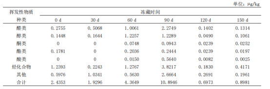 新鮮紅燒肉至150d揮發(fā)性物質(zhì)分別為57種、72種、49種、60種、66種、57種。整個貯藏期醛類物質(zhì)和酸類物質(zhì)種類數(shù)量先增加再減少,醇類、烴化合物和其他類揮發(fā)性物質(zhì)數(shù)量呈現(xiàn)先增多然后減少再增多的現(xiàn)象,酮類物質(zhì)種類數(shù)量隨時間增加。但各個貯藏期各類揮發(fā)性物質(zhì)的含量呈現(xiàn)先上升再下降的現(xiàn)象,其中120d起于之后的兩個貯藏期相比揮發(fā)性物質(zhì)含量有較大的降低,表明氣味隨凍藏時間的延長,前期變化小,而120d后風味有所衰減,但衰減程度不大,對整體風味品質(zhì)影響不大。