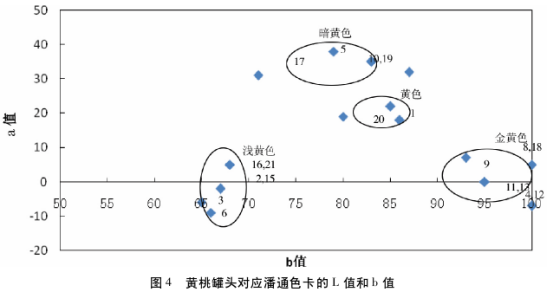 黃桃罐頭對應(yīng)潘通色卡L值和b值分布見圖3,可以看出金黃色b值最大在90~100之間;淺黃色b值最小,在60~70之間,黃色b值在80~90之間,暗黃色b值在70~80之間。金黃色L值范圍80~90之間,黃色L值在70~80之間,淺黃色L值最大在80~90之間,暗黃色L值在60~70之間。