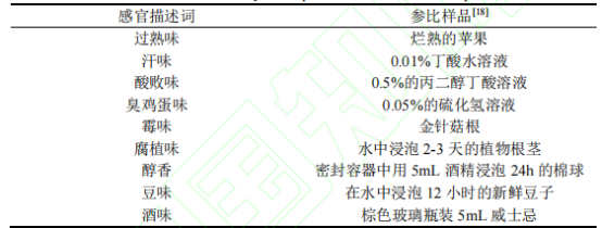 感官評價(jià)人員由4名經(jīng)過1個月的香氣描述培訓(xùn)的人員組成,感官描述詞由評價(jià)員投票決定。根據(jù)ISO4121-2003標(biāo)準(zhǔn),實(shí)驗(yàn)在20℃恒溫且通風(fēng)的房間內(nèi)進(jìn)行,每個成員禁止交流,保證不會互相影響。樣品風(fēng)味按照0~5級評分(0為沒有味道,3為有味道,5為味道非常強(qiáng)烈),感官描述詞最終得分取所有成員的平均分。