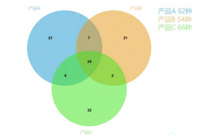 揮發(fā)性風(fēng)味成分分析表2展示了不同市售霉莧菜梗中檢測出揮發(fā)性成分種類、數(shù)量和含量存在差異,這可能和霉莧菜梗的發(fā)酵原料、微生物以及發(fā)酵過程有關(guān)。采用NIST11標(biāo)準(zhǔn)譜庫檢索進(jìn)行對比定性分析,保留相似度大于80%的化合物,共檢測出揮發(fā)性風(fēng)味成分117種,其中醛類15種、醇類32種、酯類20種、酮類11種、酸類5種、酚類6種烷類10種、烯烴類12種、醚類2種和其他類5種(表2)。不同市售霉莧菜梗鑒定出的揮發(fā)性成分?jǐn)?shù)量不同,產(chǎn)品A、B、C分別鑒定出62、54、66種揮發(fā)性風(fēng)味成分,3種霉莧菜梗共有揮發(fā)性風(fēng)味成分有24種(圖3)。