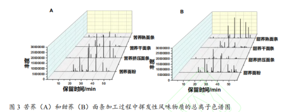 蕎麥營養(yǎng)全面,富含多酚、黃酮等生物活性成分,對人體有顯著的健康效益。蕎麥制品尤其是其面條制品在世界范圍內(nèi)受到了越來越多的關(guān)注。本文主要研究全苦蕎面條和全甜蕎面條在擠壓加工及烘干、蒸煮過程中的主要揮發(fā)性風(fēng)味物質(zhì)組成和變化情況。
