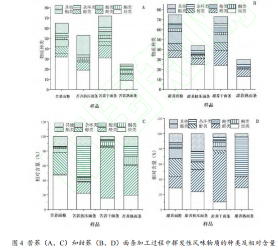 經(jīng)GC-MS分析后,并與NIST08.L和RTLPEST3.L數(shù)據(jù)庫對比,在苦蕎粉、苦蕎擠壓面條、苦蕎干面條、苦蕎熟面條中分別鑒定出66種、53種、72種、25種揮發(fā)性風(fēng)味物質(zhì)。在甜蕎粉、甜蕎擠壓面條、甜蕎干面條、甜蕎熟面條中分別鑒定出75種、44種、73種、30種揮發(fā)性風(fēng)味物質(zhì)。